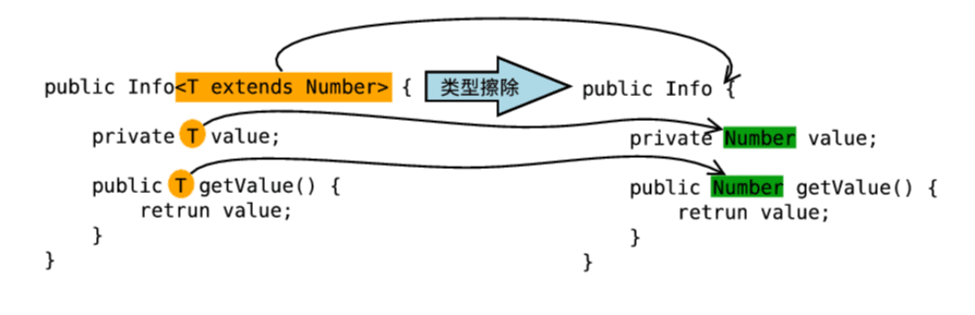 有限制泛型擦除,当类或方法参数等类型参数存在限制(上下界)时,即形如 <T extends Number><? extends Number><? super Number> 的类型参数都属于有限制泛型擦除。在进行有限制泛型擦除的时候 Java 编译器会将这些泛型信息进行变更。其中 extends 修饰的会被替换成具体的类型,如 <T extends Number> 会替换为 Numbersuper 修饰的会被替换为 Object