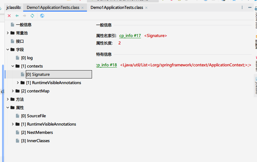 可以看到特有信息里出现了 ApplicationContext 的身影,这就是保留下来的泛型信息。在 Java 中,以下场景都会提供签名: